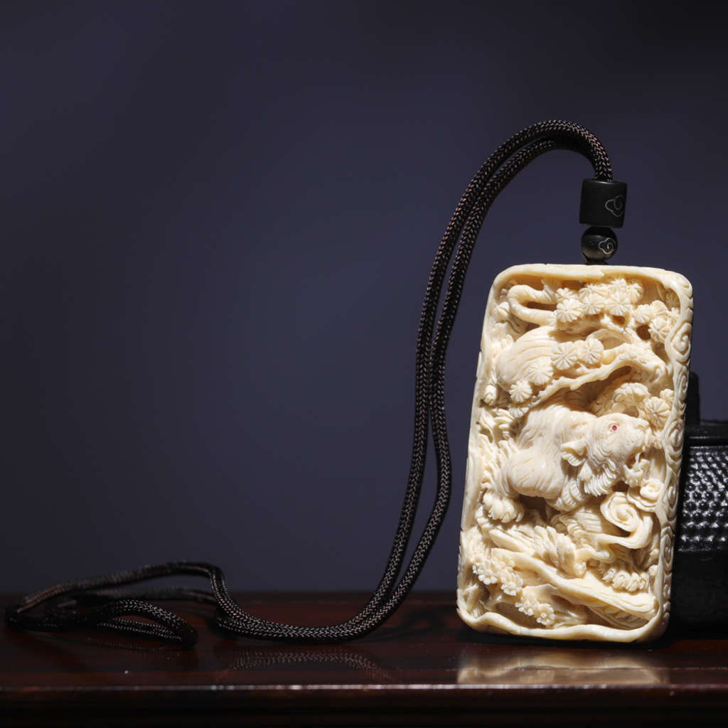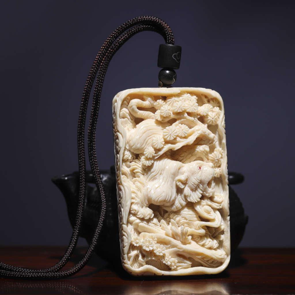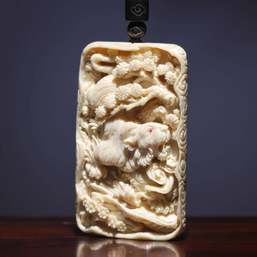 【猛犸牙雕作品】《虎牌》,猛虎出門覓食,威風凜凜,霸氣十足。細節刻畫十分精細,意境十足,突出虎威,鎮邪驅煞。老師傅純手工創作款,精選猛犸帶皮冰料!紋路清晰,料子潤澤。