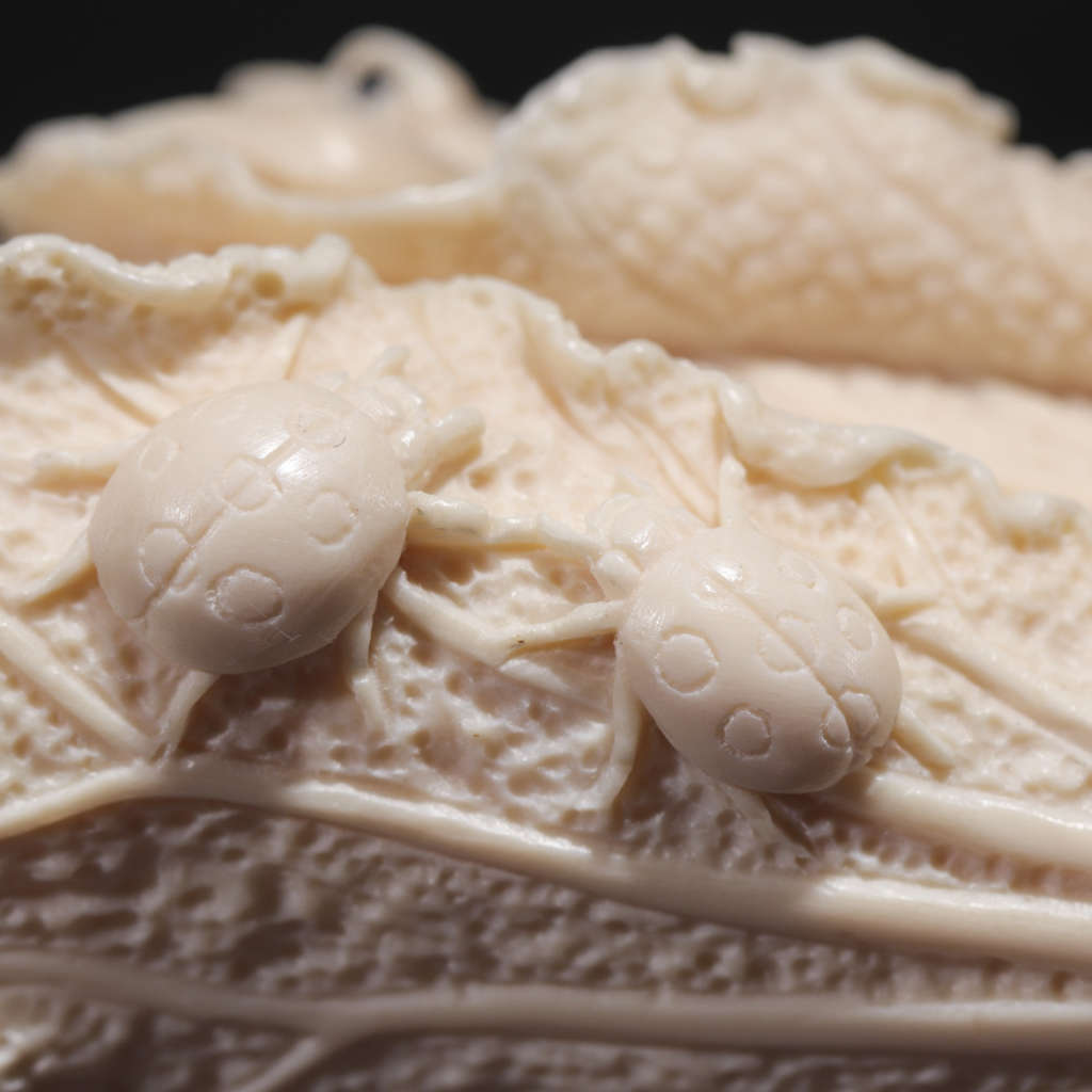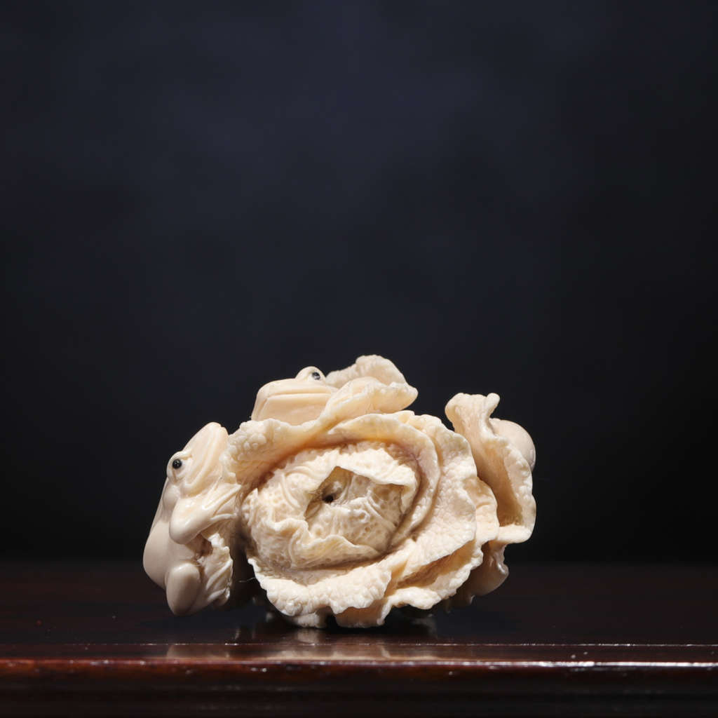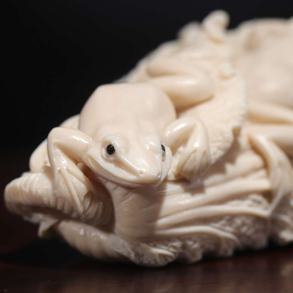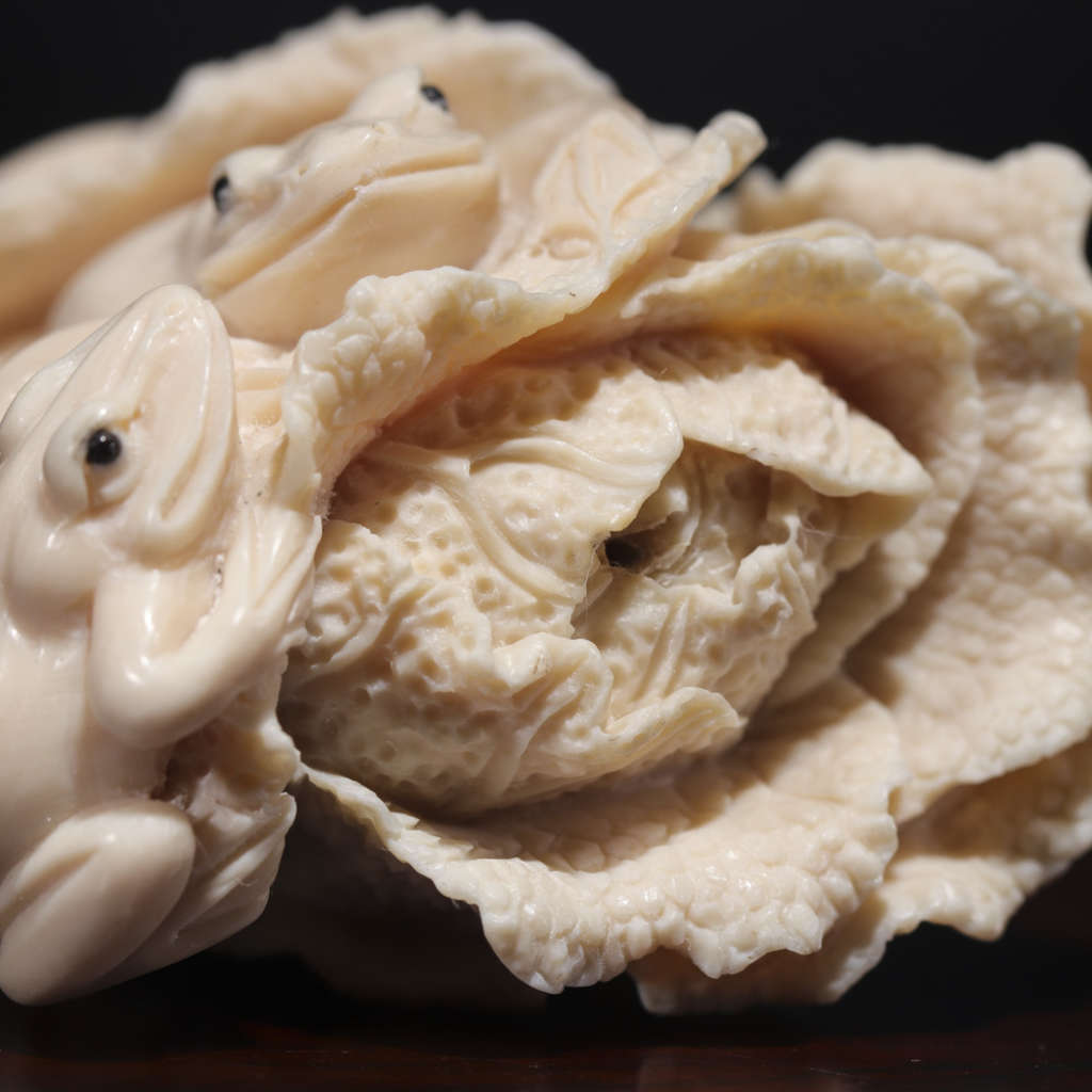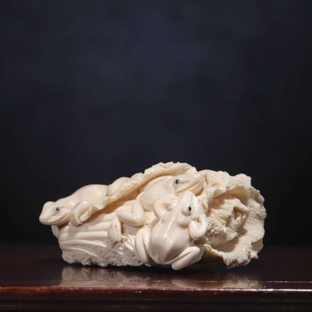 【猛犸牙雕作品】《百財》,精選上乘猛犸冰料!老師傅操刀!雕工立體,細節(jié)完美!題材寓意極佳,白片徐徐舒卷,菜根粗須纏繞,攀附其上的三只青蛙更是畫龍點睛之筆,使整個作品自然靈動,生趣盎然。青蛙昆蟲在古代亦有多子多孫的意思!白菜則諧音遇百財,寓意財運到,福運到,財源滾滾來!