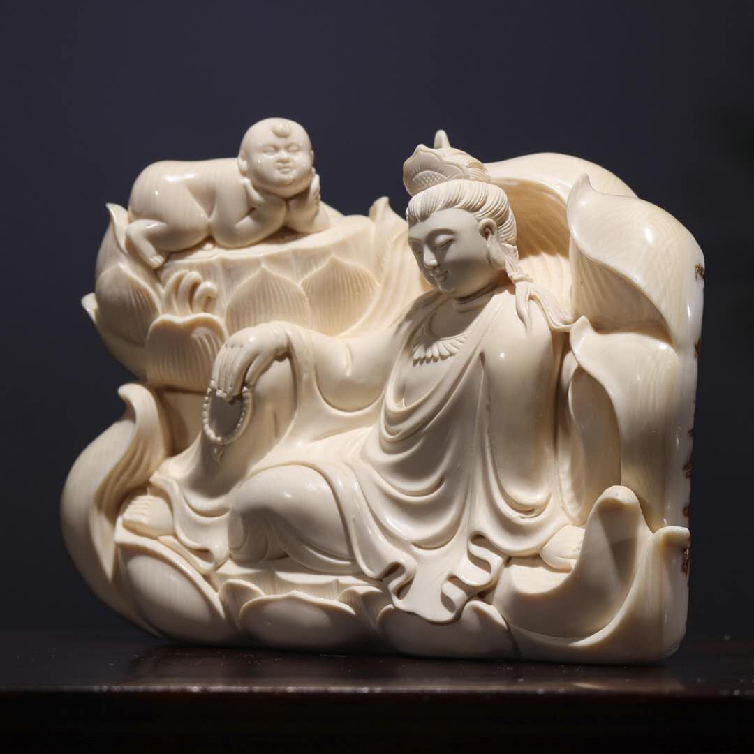 《童子拜觀音》觀音菩薩其容貌飽滿圓潤,姿態端莊秀美,品性慈悲善良,內心平和寧靜,救苦救難,普度眾生。精選上乘猛犸帶皮冰料,十分值得珍藏的上品!