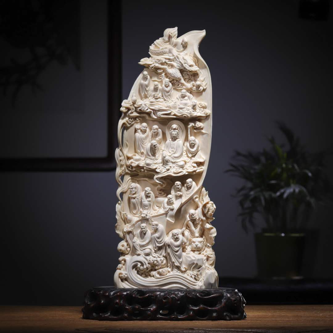 《九龍拉棺》九龍拉棺是尊貴權威的象征!寓意升官發財,大業有所成,前途無限量!由二十年老師傅親手操刀!精選上乘猛犸象牙帶皮冰料!紋路飽滿,質感潤澤!