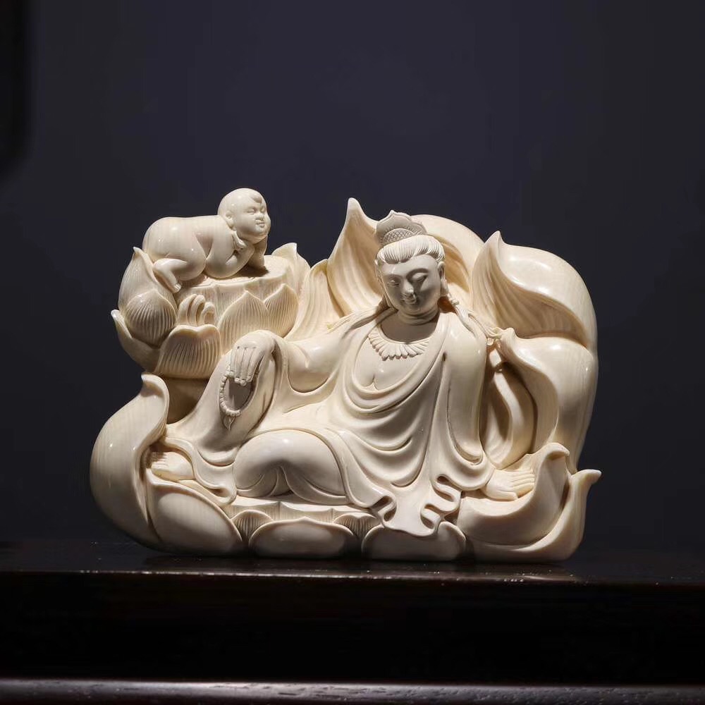 猛犸象牙《童子拜觀音》觀音菩薩其容貌飽滿圓潤,姿態端莊秀美,品性慈悲善良
