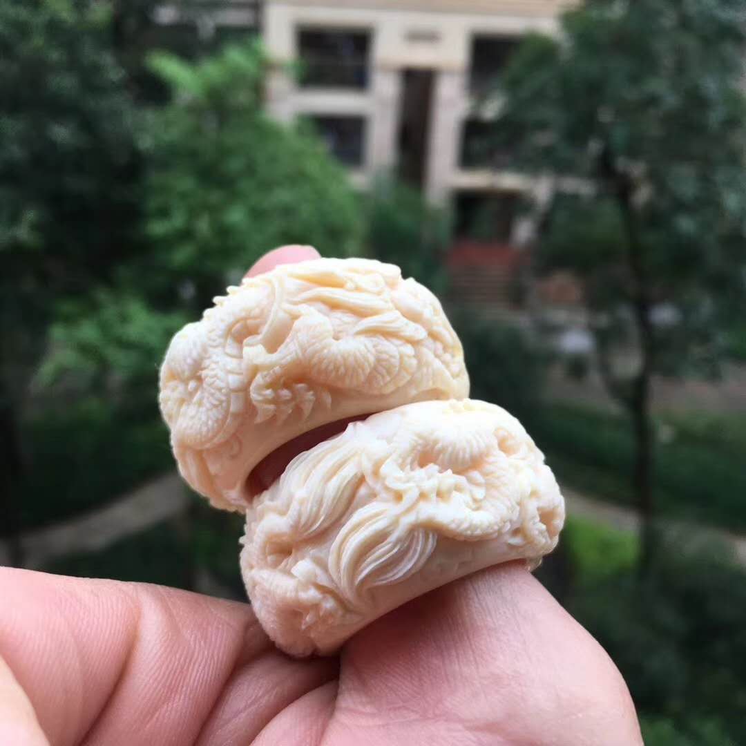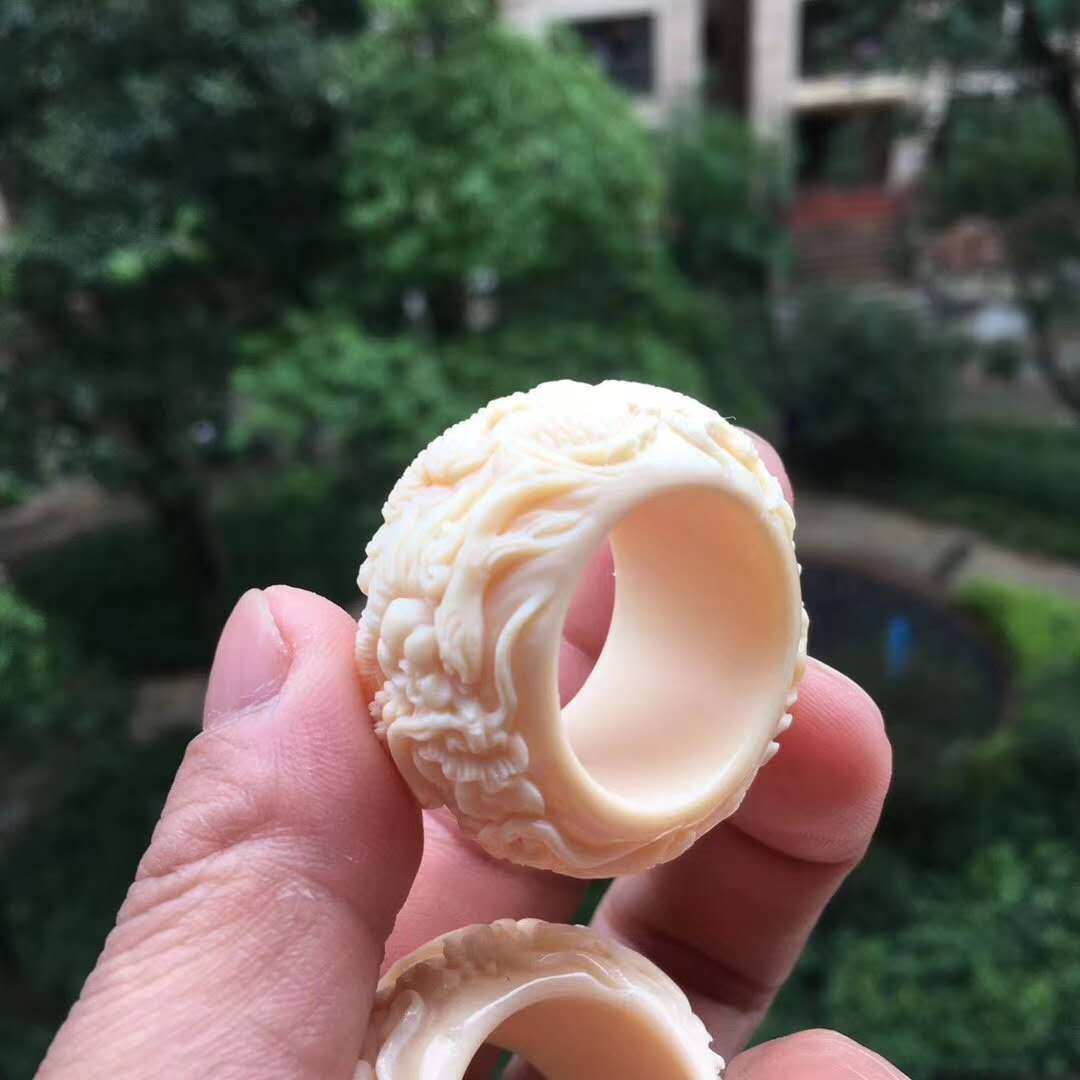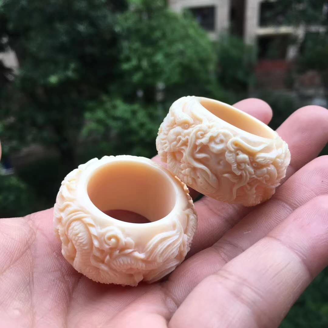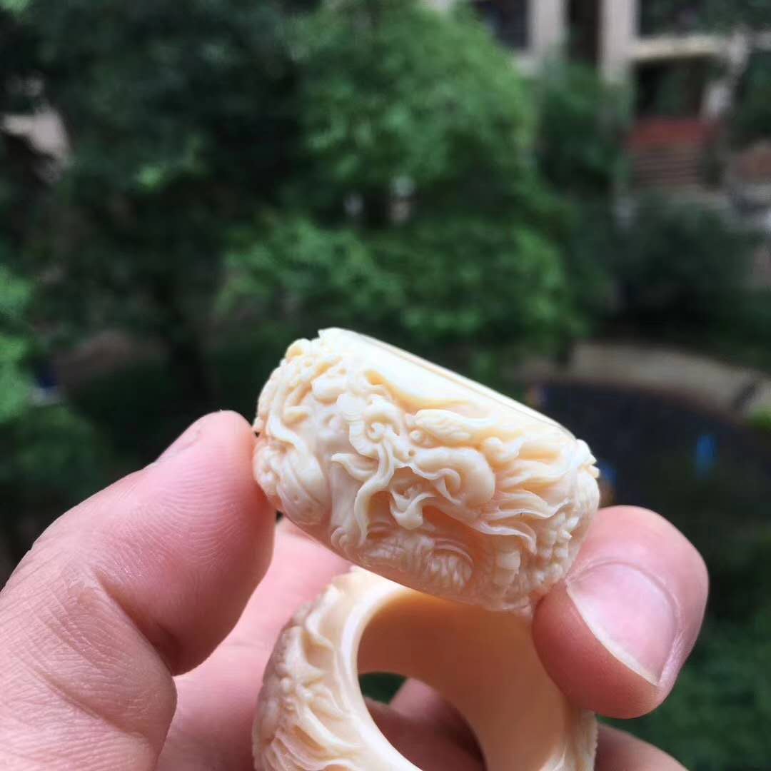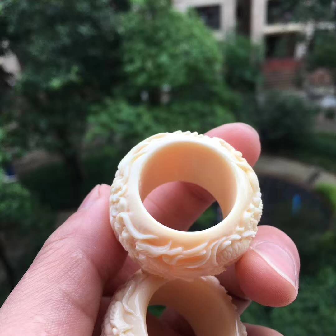 雙龍戲珠執掌天下,環繞式立體浮雕滿工扳指配飾,全果凍料肉色水潤無比,純手工雕琢。圈口20~24mm,約17g