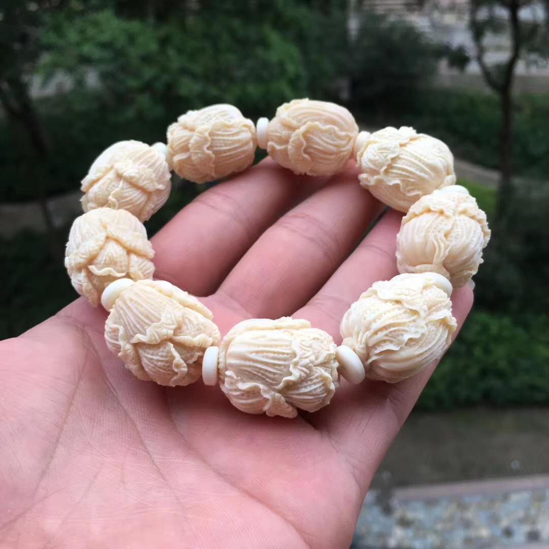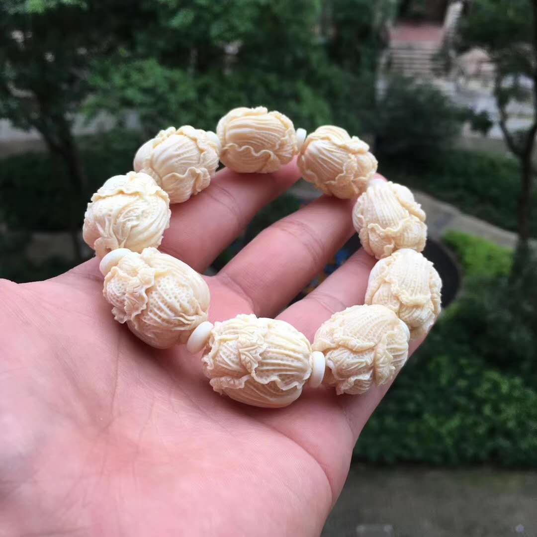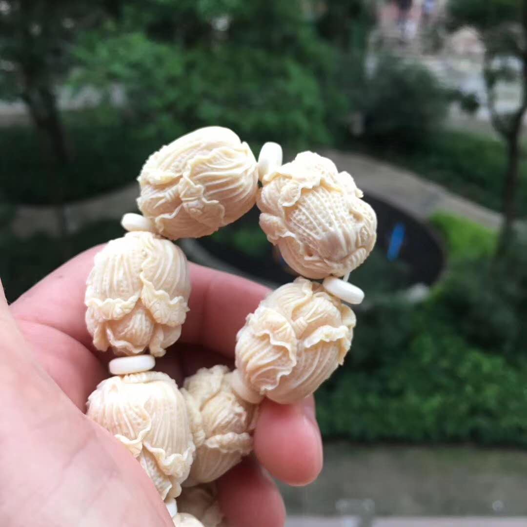 猛犸牙雕白菜手串,意為百財聚財招財發財,百財聚來的美好寓意,顆顆精挑細選把玩易包漿,好上色,料色水潤透光紅潤。20×24mm,70g