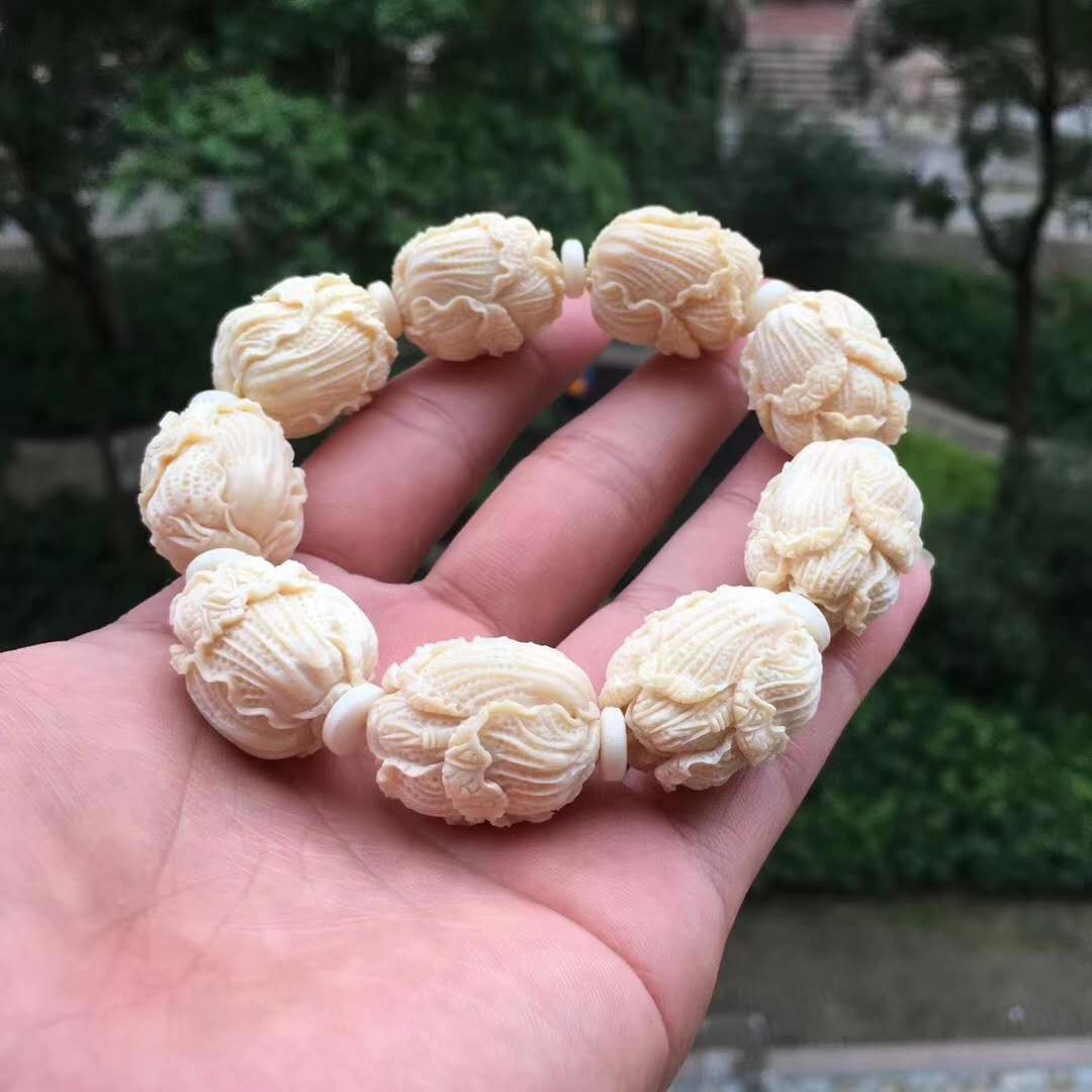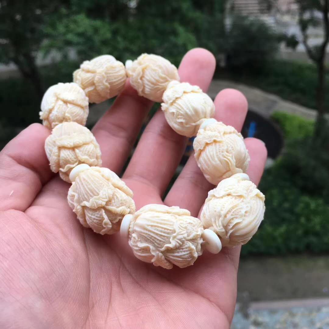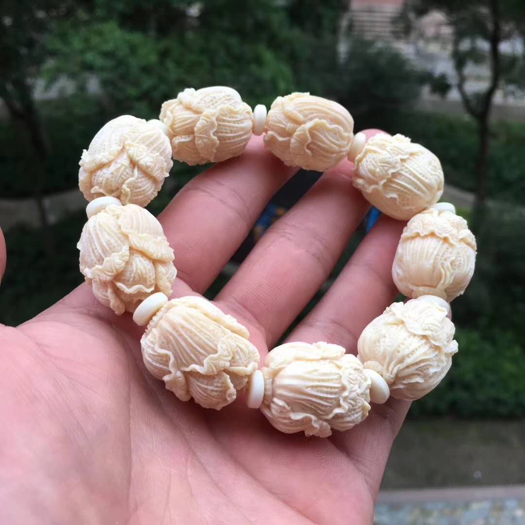 猛犸牙雕白菜手串,意為百財聚財招財發財,百財聚來的美好寓意,顆顆精挑細選把玩易包漿,好上色,料色水潤透光紅潤。20×24mm,70g