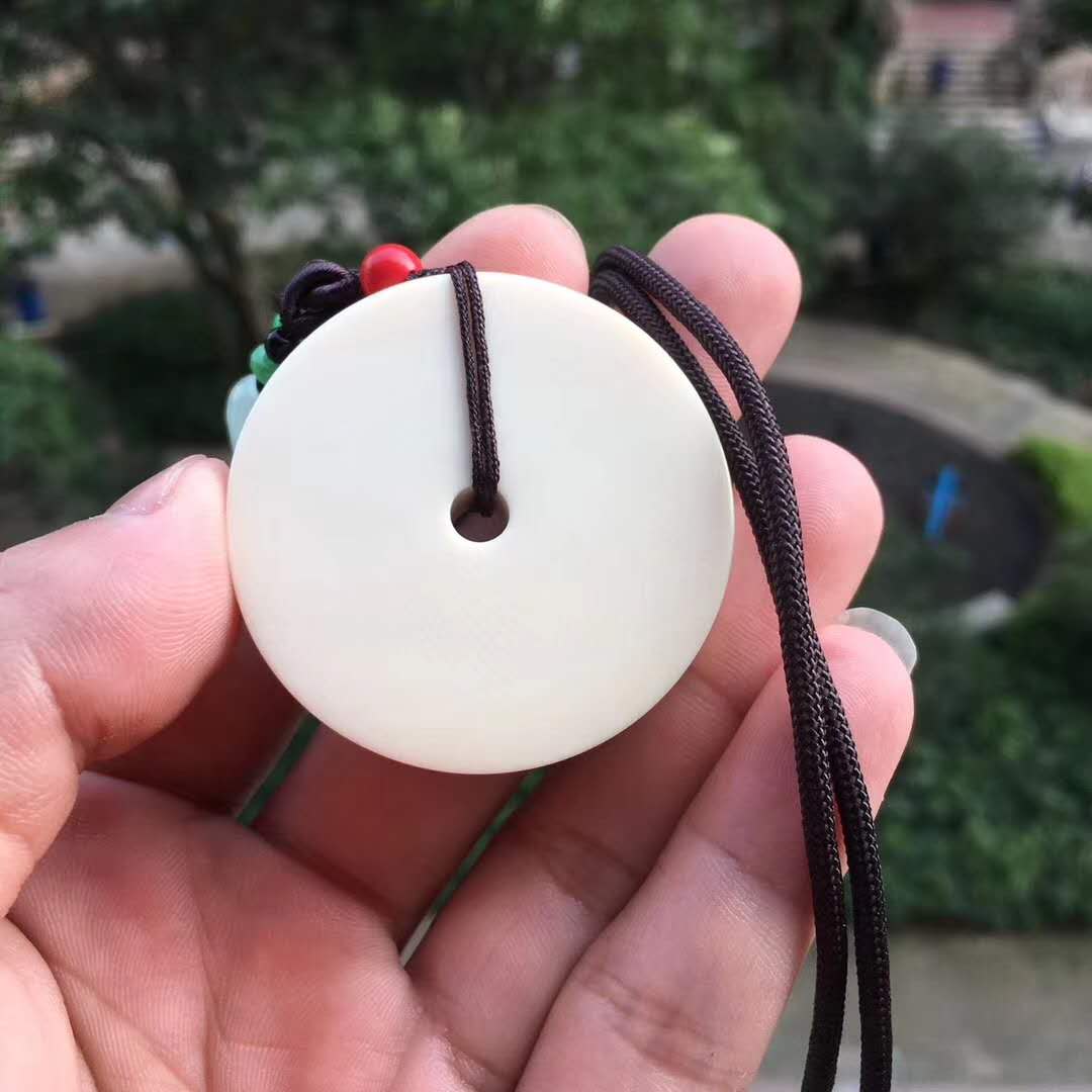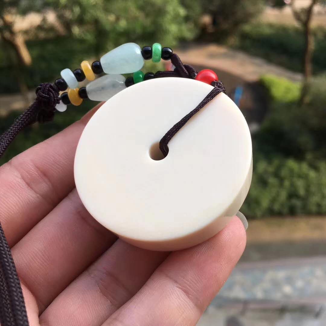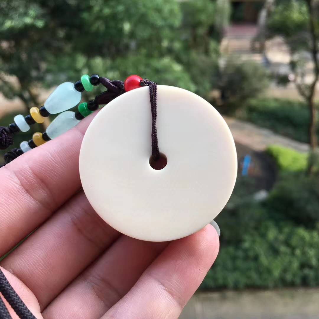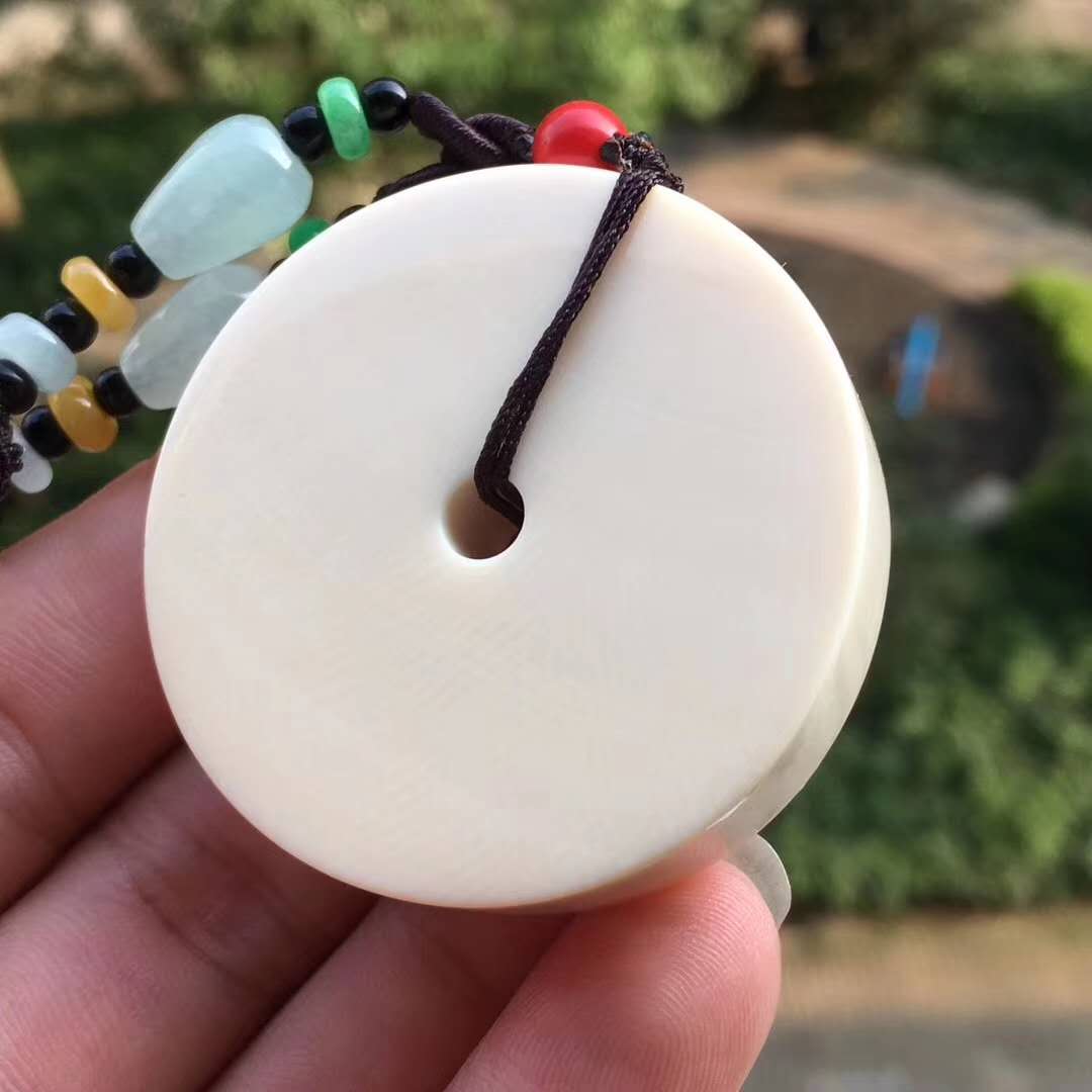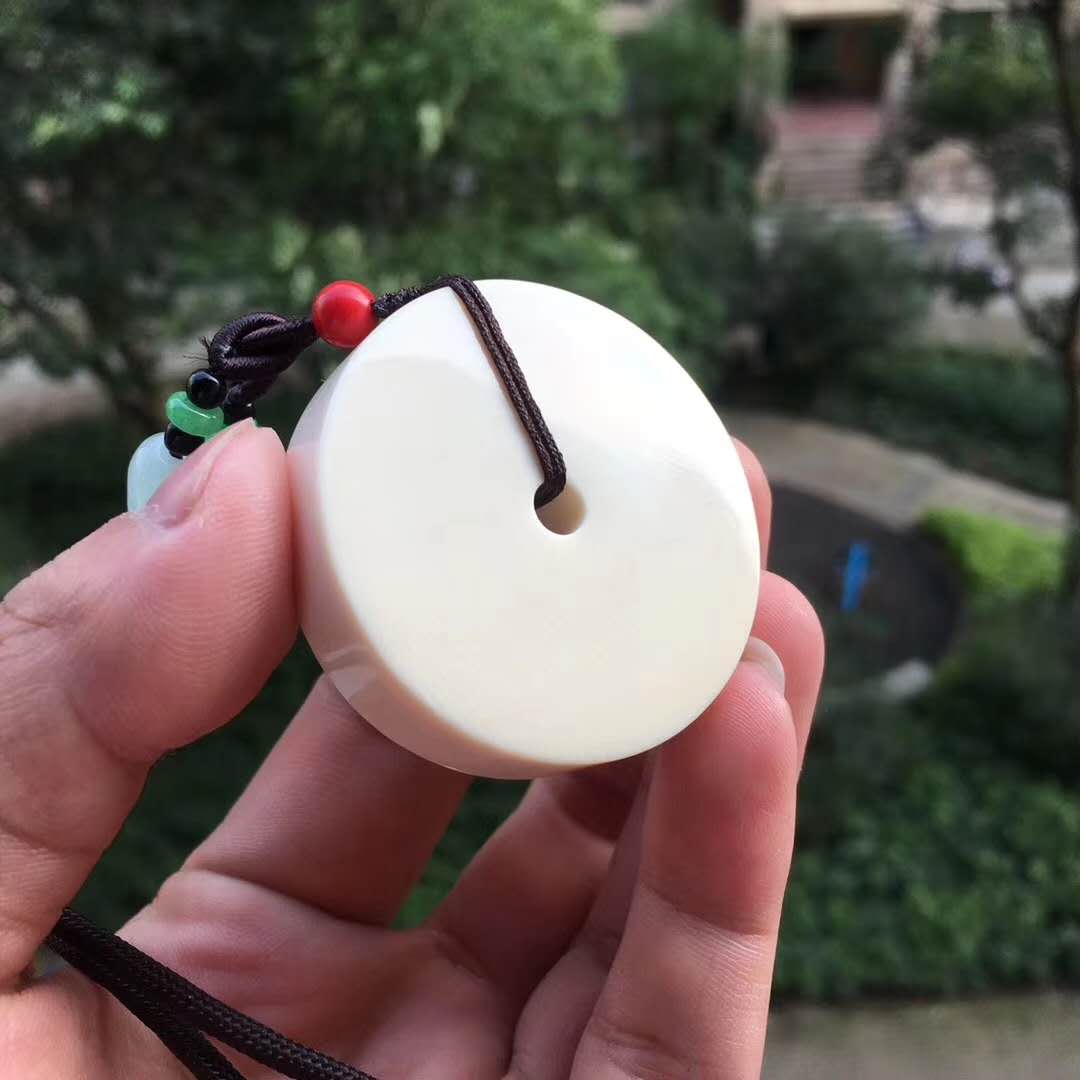 猛犸牙雕滿紋平安扣吊墜,完美冰料面包圈項鏈,圓潤飽滿肉色冰潤,紋路細膩清晰可辨。44×11mm,27g