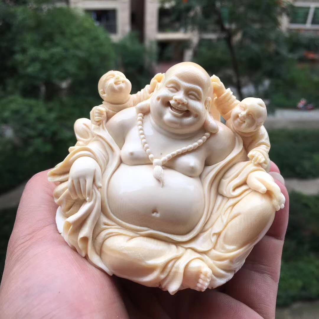猛犸象牙雕雙子笑佛,收藏級小佛擺件。天工緣作,簡潔溫潤,佛態祥和栩栩如生。雙童嬉戲玩耍自在快樂。整料圓雕配手工實木底座。78×73×53mm,234g