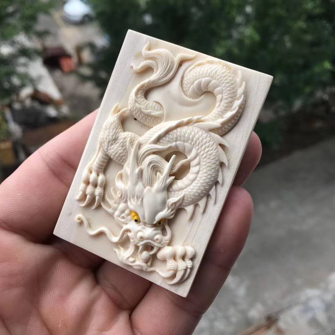 猛犸象牙雕【祥龍獻瑞】勇創作品,純手工立體精雕,工藝精湛,難得佳品,雕刻簡介大氣,原色極品藍皮,大師落款,尺寸67*45*15mm, 重47.5g。克價黨繞行!精品緣作