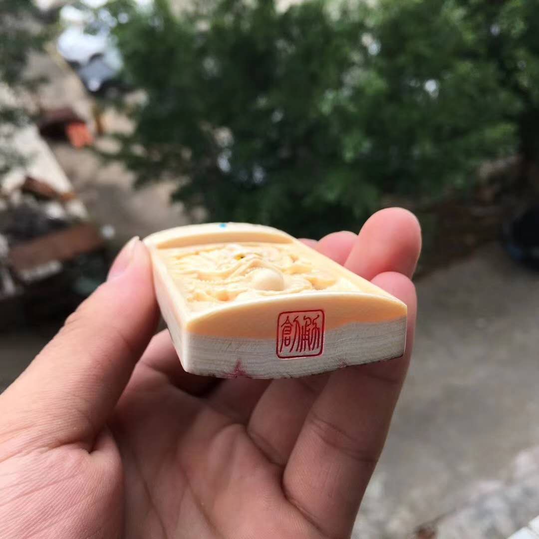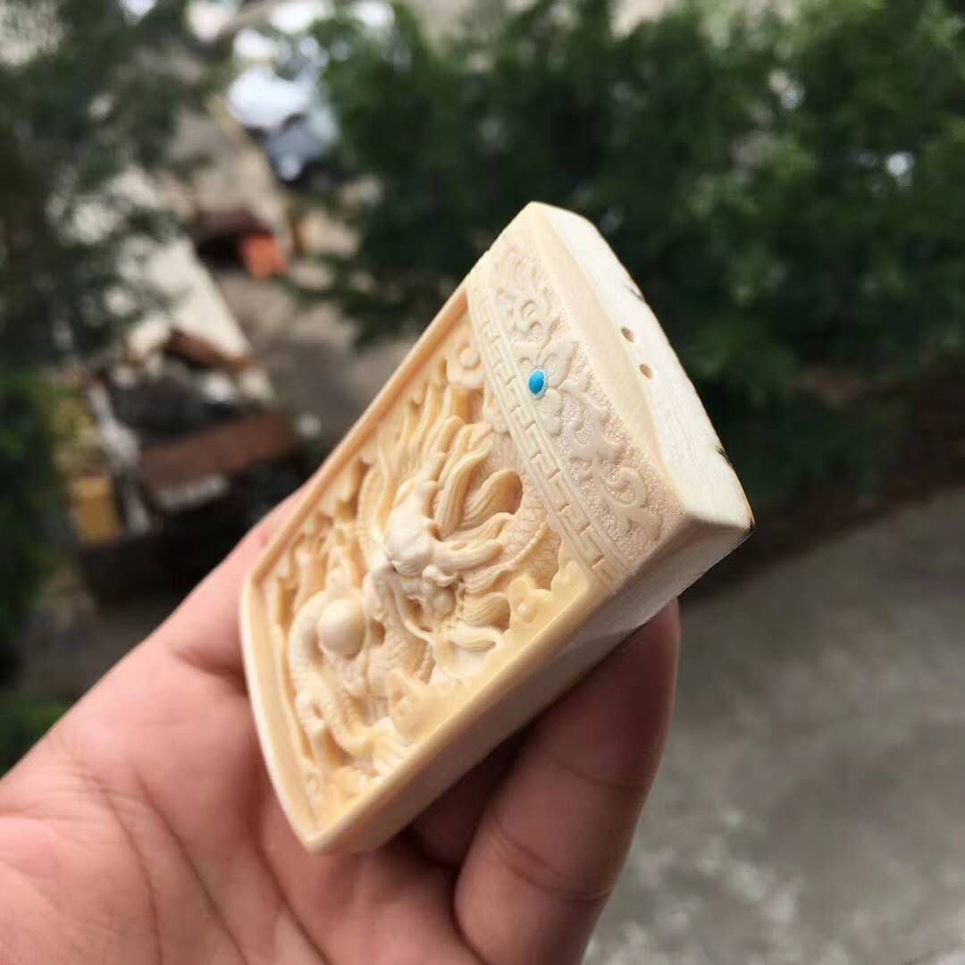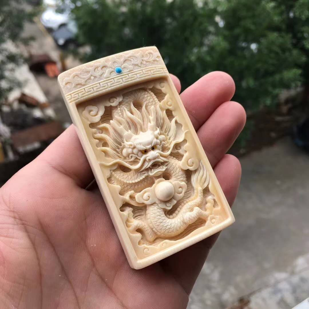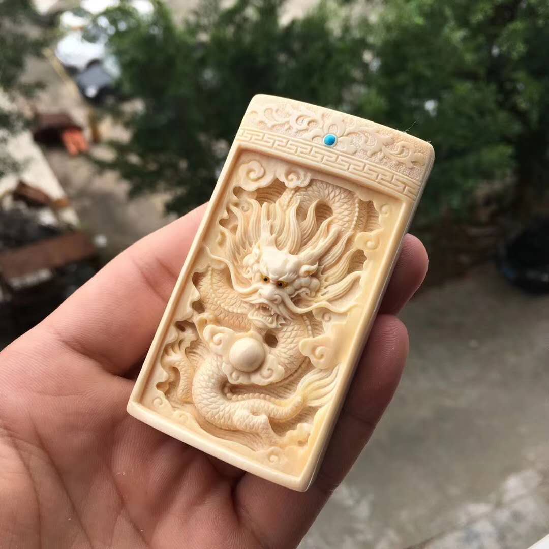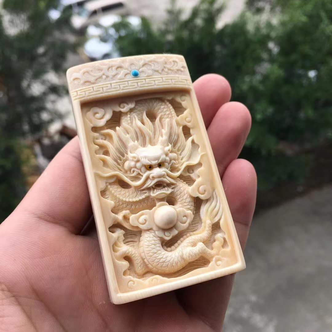 周凌勇老師作品【祥龍戲珠】掛牌。牙質水潤,細致入微的雕工勾勒,活靈活現,神形俱備,霸氣十足!背部天然猛犸牙皮,高端大氣!尺寸78*44*17mm,重65.3g。精品緣尋