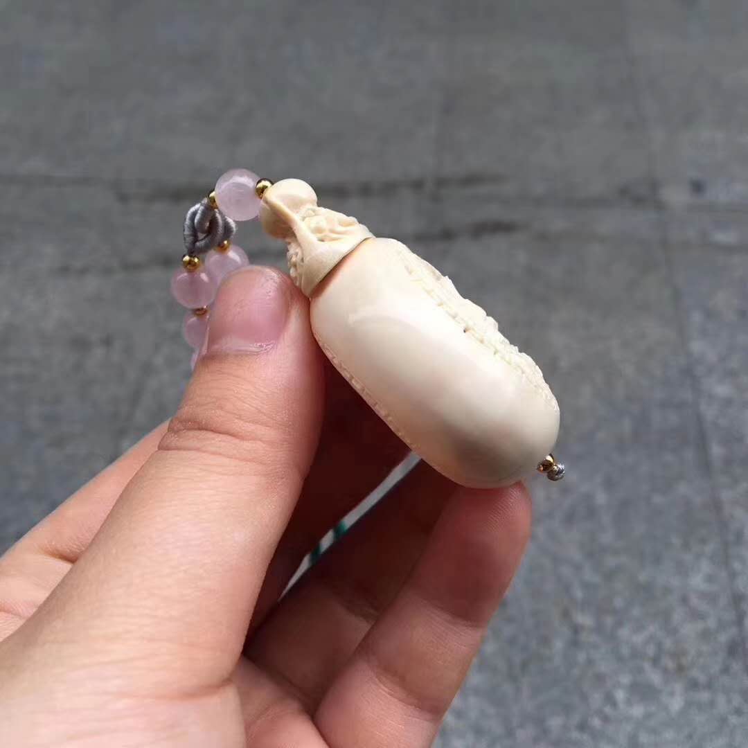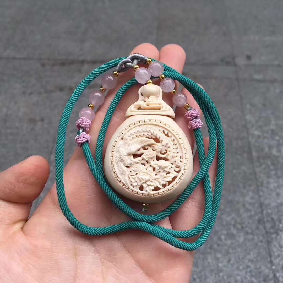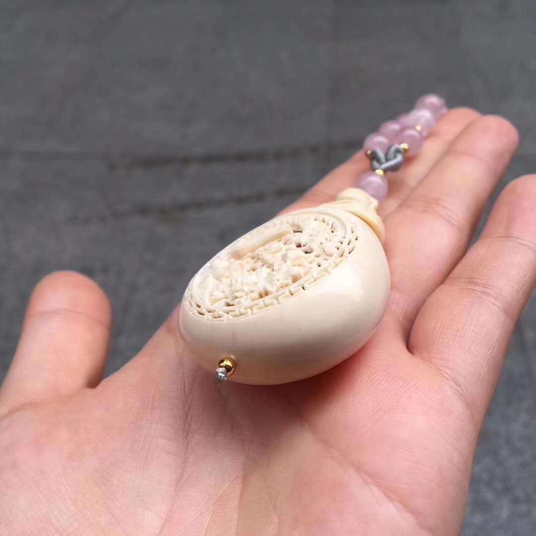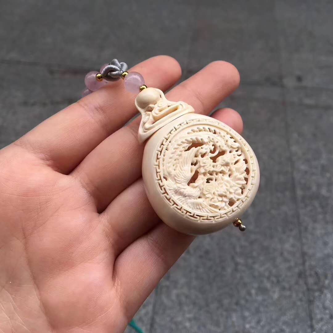 精工鳳戲牡丹香囊,牙質白冰細膩,工藝極致鏤空,細節無可挑剔。鳳凰--百鳥之王 嬉戲,百花之王――牡丹,寓意是萬物歡欣,百鳥朝賀,象征天下太平,四海同春。規格:38×51×18mm,凈重約:13克!