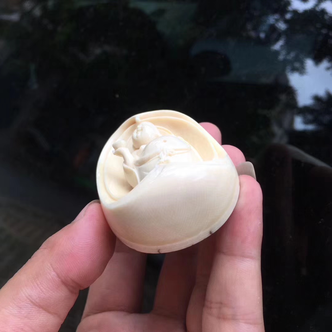 猛犸牙雕作品元寶彌勒佛掛牌,大師意境之作。大肚彌勒面容祥和,